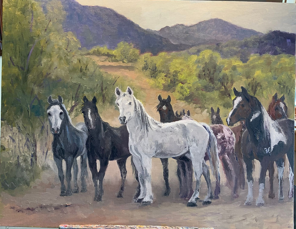 Other than my Grandmother’s guiding hand and a year of Art at the University of Wyoming I have been primarily self-taught. My voracious online studies really took off during the Covid lockdown when I discovered the Tucson Art Academy Online (TAAO) in 2020. I can’t say that I’m a new artist, but I am relatively new at selling my art. I sold a few pieces when I was a new mother, but pretty much quit painting for nearly 50 years. When I started studying and painting through the Tucson Art Academy I was running out of space for all the paintings I was doing and friends and family started buying them which was keeping me in art supplies. So I started a Facebook page and my sales started increasing. I have done quite a few commissioned pieces and am hoping to find new outlets.